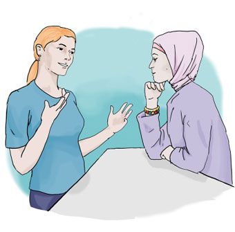 - Die Mitarbeiterinnen beraten Frauen* bei verschiedenen Problemen.