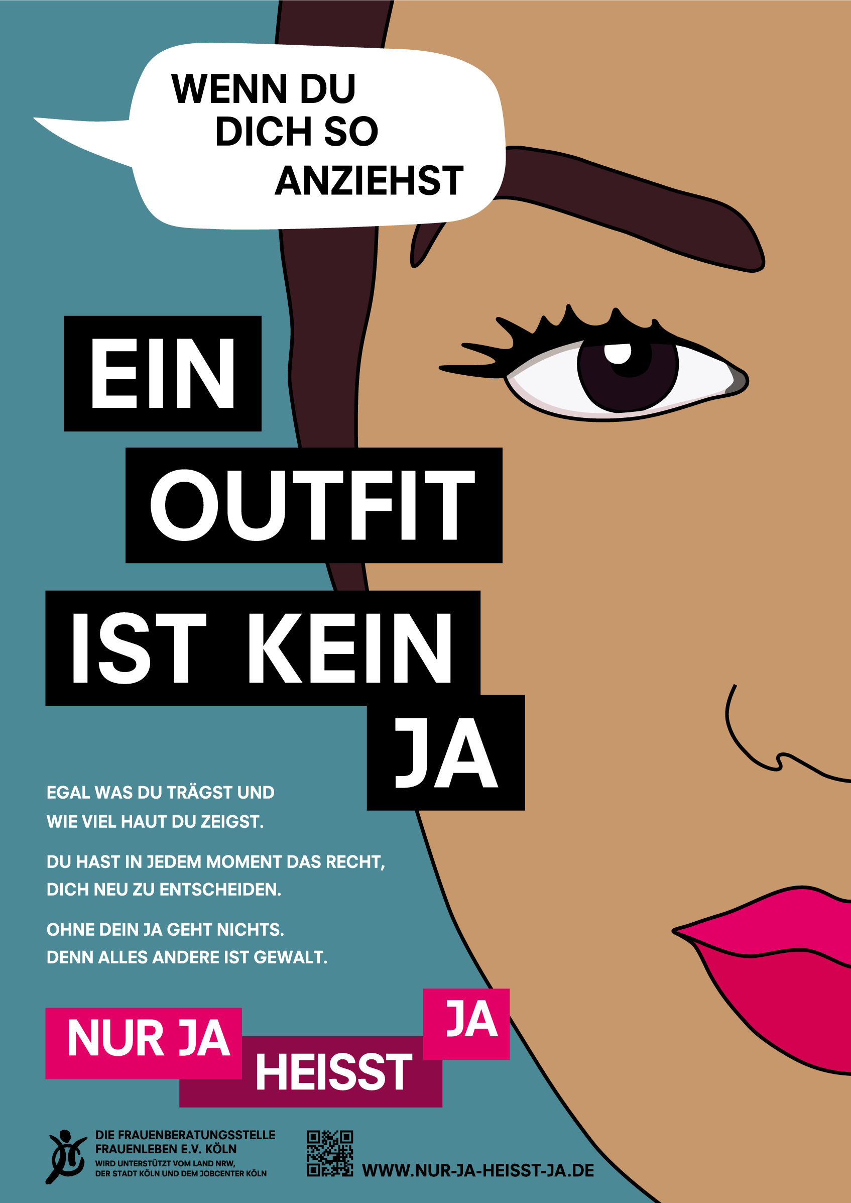"Ein Outfit ist kein Ja" nimmt Aussehen, Kleidungsstil und optischen Aspekten in den Mittelpunkt. Bis heute fällt die Frage "Was hattest du an?", statt deutlich zu machen, dass ein Outfit niemals automatisch als Einverständnis gewertet werden kann. Egal, welche Kleidung du wählst – Consent kann nie einfach vorausgesetzt werden.